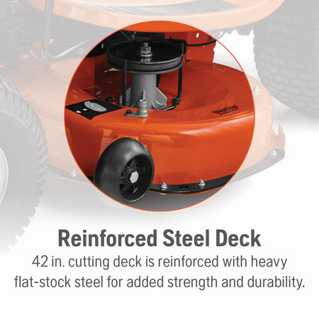 - Great for uneven terrain, this riding lawn tractor has two anti-scalp wheels to reduce risk of scalping and a cast iron front axle for extra stability