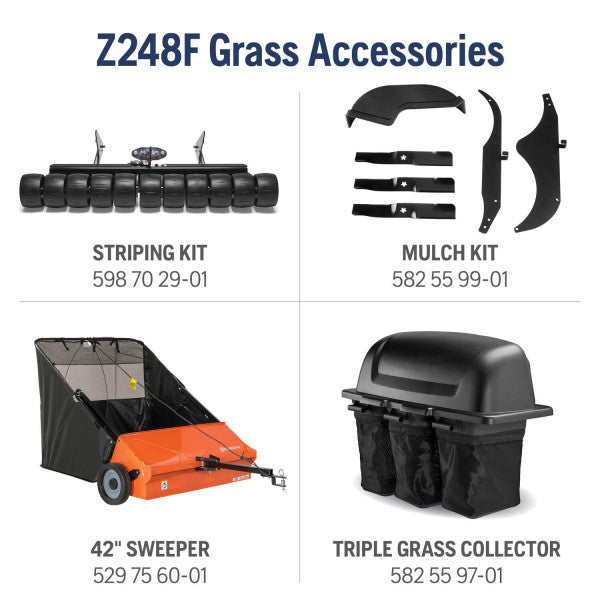 For added comfort and safety, the Z248F features a high-back seat, ergonomic control panel, and anti-slip foot area. The integrated front guard and bumper offer extra protection during operation. Additionally, this mower is compatible with a range of lawn care accessories, such as mulching kits and bagger attachments, making it a versatile choice for homeowners.