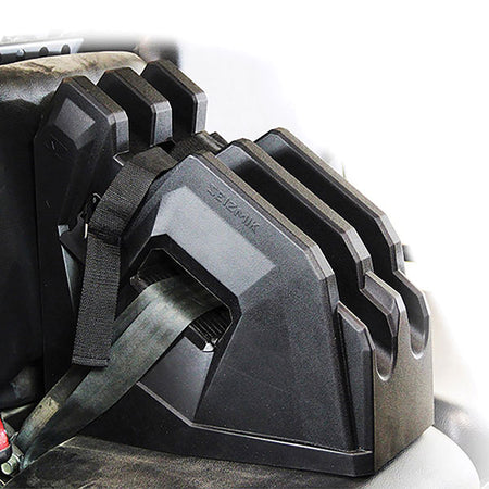 The ICOS (In Cab On Seat) Gun Holder requires no tools, installs in seconds, and utilizes the vehicles existing seat belt to mount within the UTV. It offers fantastic muzzle control, keeping the gun barrels pointed safely at the floor of the vehicle. Made entirely of closed cell foam, the ICOS provides two padded channels that wont damage the guns finish or come in contact with the weapons optics or sights. Compression straps with buckles (i.e. no Velcro straps) are used to secure the gun within the channels, so storing or retrieving a weapon wont alert game. The ICOSs brilliance is its simplicity.