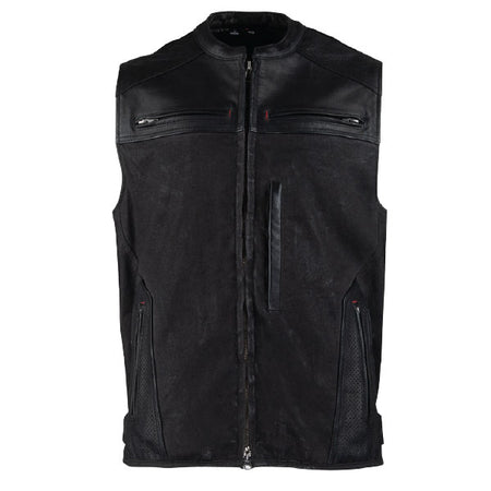 The Speed and Strength Tough as Nails motorcycle vest built with a combine leather and waxed canvas frame and comes equipped with a removable Vault C.E. approved spine protector.