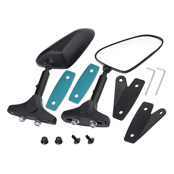 Included Items: (1) Black right side mirror assembly, (1) Black left side mirror assembly, (2) Flat backer plates, (2) Angled backer plates, (2) 6mm-1.00 x 16mm Button head bolts, (2) 6mm-1.00 Flange hex lock nuts, (2) Allen wrenches, Instructions